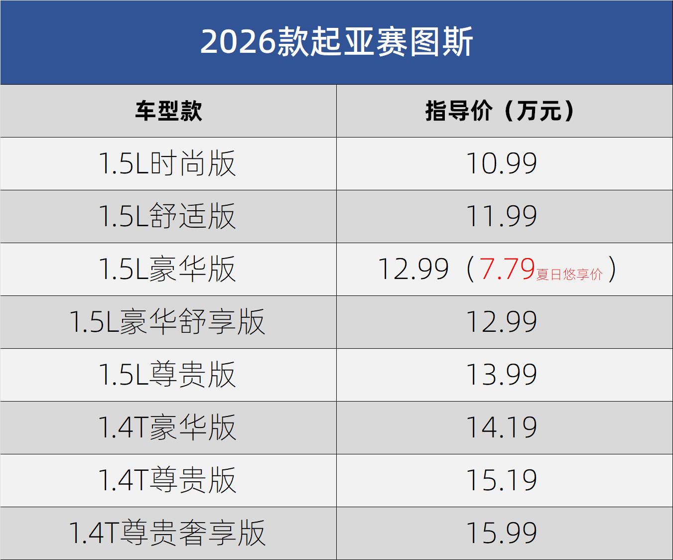 7月2日,東風悅達起亞官方宣布,2026款賽圖斯正式上市,新車新增一款“1.5L豪華舒享版”,共計8個車款,官方指導價區間為10.99-15.99萬元。同時在7月1日-7月31日期間,購買1.5L豪華版可享“夏日悠享價”7.79萬元。同時官方還推出限時購車福利,包括金融貼息至高5000元、定向人群贈送2000元油卡及高校畢業生優惠4000元、5年5次基礎保養材料免費等多項超值權益。