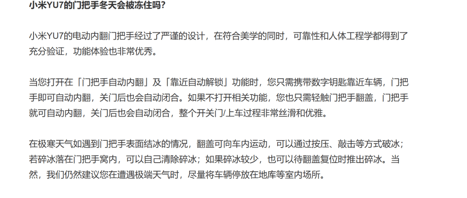 用了全隱藏式的小米YU7,門把手蓋板并不完全依賴電動開啟和閉合,可以手動把蓋板往里面翻。其次門把手有兩種解鎖方式,常規情況下是電動,在發生碰撞后會變成機械解鎖,并且對于冬天場景也做了相應優化。
