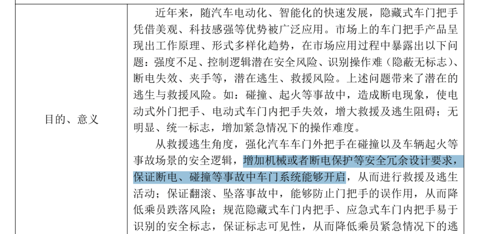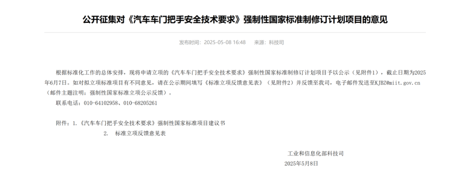 早在今年5月份,工信部已經公開征集了關于門把手強制國標的修訂意見,除了要求車內門把手要有明顯和易于識別的標志外,最重要是要求增加機械或斷電保護等安全冗余設計,就算斷電了,也要保證車門能打開。其實之前也有行業標準(QC/T 988-2014、QCT1211-2024)對門把手的要求,主要針對開啟力度大小、耐久性等方面,但都只是推薦性標準,跟強制性國標的執行力度沒法比。