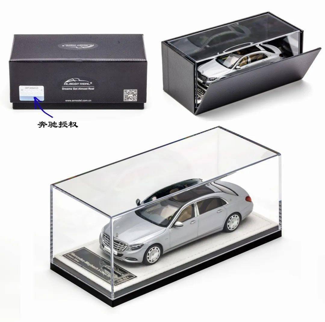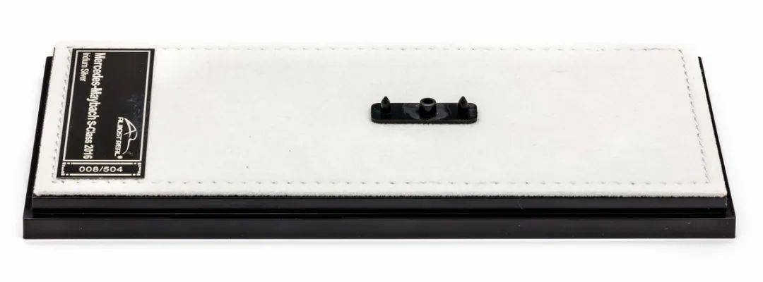 這款邁巴赫S級采用了較為高級的禮盒包裝,同樣的包裝之前采用在AR車展特供版的賓利GT3上,而包裝上有明顯的奔馳授權標志。打開上面的紙盒蓋后,放置車模的內紙盒前面可以開口,方便車模的取出。和之前AR的43系列產品一致,這款模型的有機罩也是非常通透、邊緣整潔。而這款邁巴赫與之前產品不同的地方是底座上加了一層皮革的墊子,瞬間增加了模型的逼格。底座上的銘牌是金屬材質了,也體現了這款模型的市場定位——中高端禮品市場。