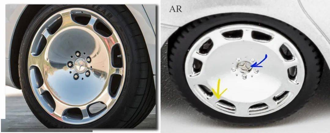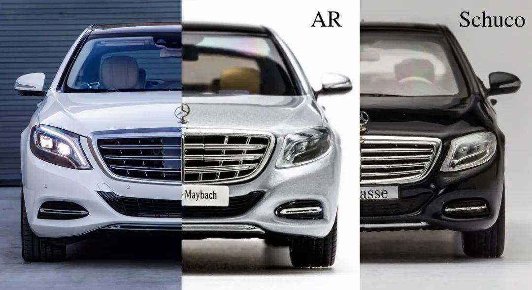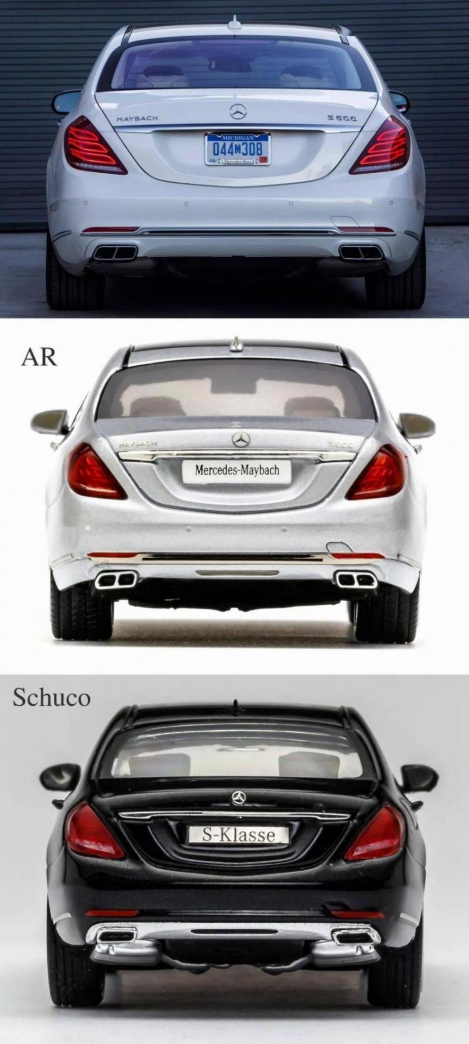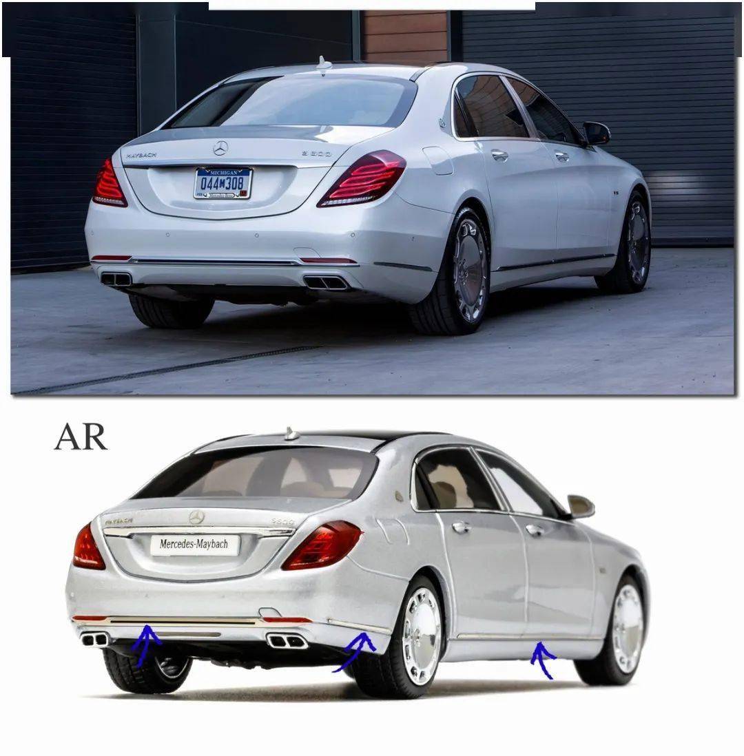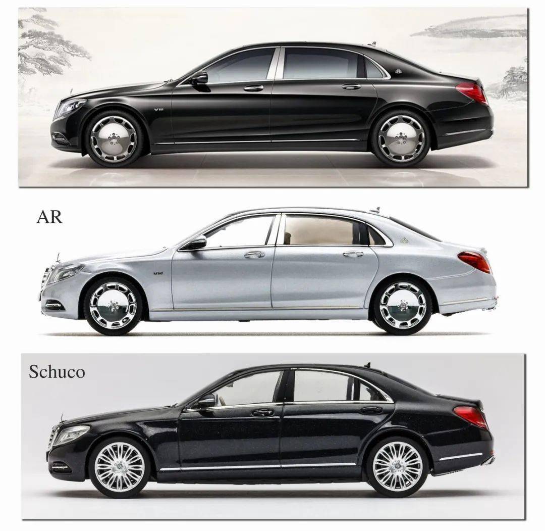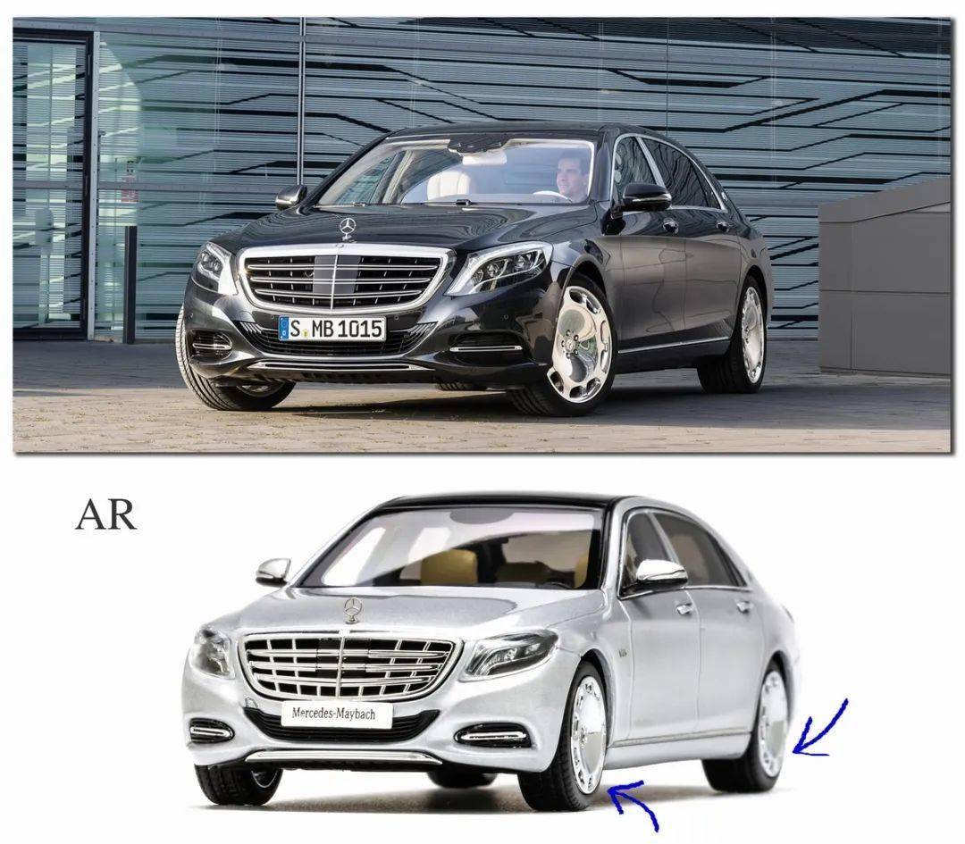 側面和真車對比,AR的邁巴赫S級在各處比例上和真車基本一致,車身的腰線方面模型確實無法還原出真車的凌厲,這對于小比例合金車模來說確實有點勉為其難,其實樹脂的小比例在銳利方面也是沒法達到理想的水準。這款模型在縫隙方面做得比之前AR的攬勝要好,漆水也沒有那么厚。模型的車窗邊框、 門把手、大餅輪轂都采用了電鍍效果,質感不錯,而也有部分玩家反映有電鍍出現小塊脫落的情況,希望是個體現象吧。最下方的黑色車模是Schuco的奔馳S,可以看出,小比例合金模型真不是一般的肉啊,當然,前提是放大著來觀察。