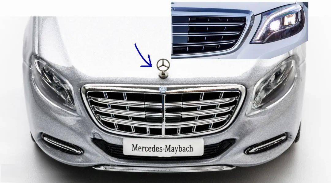 與真車相比,模型的車頭細節方面確實有一定差距,這個和比例有著莫大的關系,畢竟這些圖片都比實際肉眼看的大。同樣對比Schuco的S級,AR的邁巴赫S級有著更好的細節刻畫,這也體現了兩者的定位差別,畢竟Schuco的價格比AR的要便宜不少。AR的邁巴赫S級進氣格柵對比真車稍微做大一點,但也在可接受范圍內。同樣情況下大燈做得小了一點,內構不夠清晰,考慮到整個大燈就和一顆瓜子差不多大小,也就不強求了。