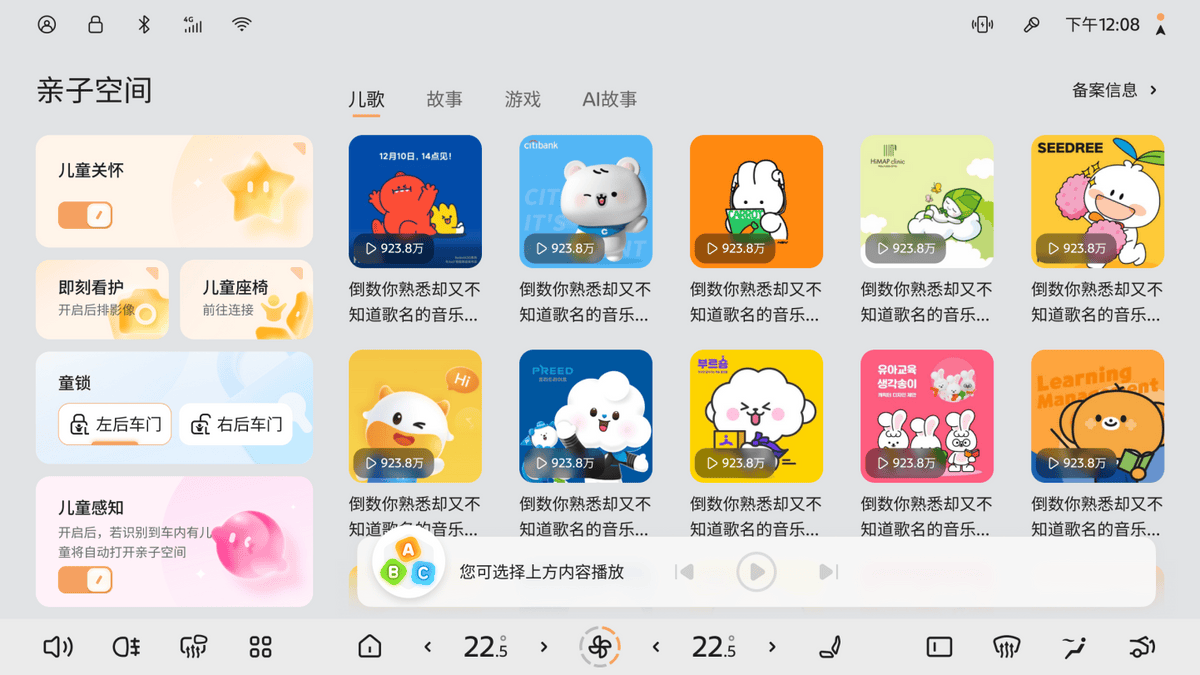 親子空間APP,集成兒童娛樂、即刻看護、兒童關懷、兒童感知、兒童鎖便捷顯示、兒童座椅調節6大高頻兒童功能,它能做到識別兒童上車后自動開啟親子空間,然后提供不同年齡段海量兒童資源,故事啊、兒歌啊、游戲等等非常多樣的娛樂資源,而且你不用擔心小孩看電視看時間長影響視力,它有個觀影時長智能管控系統,可以設定觀影時長以及休息時間,是不是非常的貼心;有時候寶媽或者寶爸單獨帶小孩出門,小孩坐在后排兒童座椅,開車的時候擔心孩子亂動或者有沒有睡著怎么辦,它還有即刻看護功能,后排影像可以在大屏上實時縮放,不用回頭看,在中控大屏里就能看到孩子的動態,是不是很安心,而且啊有一點非常值得表揚,就是只要你用的是在官方商城選購的兒童座椅,它就可以智能適配,支持通風、加熱快捷調節,小朋友也照顧到了,怎么樣,是不是關心到你心坎里去了。