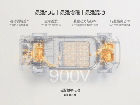 首先三電上,極氪9X搭載全棧900V混動(dòng)高壓架構(gòu),搭載70度6C混動(dòng)電池,CLTC純電續(xù)航里程可達(dá)380km,20%~80%充電時(shí)間僅需9分鐘,別忘了這可是臺(tái)插混車(chē)啊,卻有媲美純電車(chē)的體驗(yàn)。極氪9X搭載浩瀚超級(jí)電混動(dòng)力系統(tǒng),由2.0T超混專(zhuān)用發(fā)動(dòng)機(jī)+雙電機(jī)+發(fā)電機(jī)組成,一臺(tái)車(chē)就兼顧了純電、增程、混動(dòng)三臺(tái)車(chē)的特性,主打一個(gè)“我全都要”。