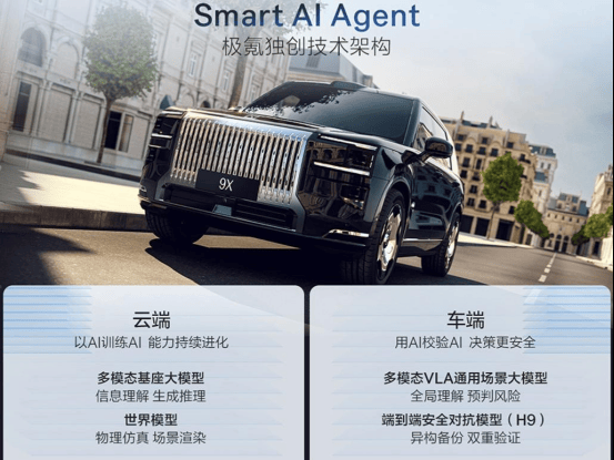 在智能駕駛輔助方面,極氪9X搭載了千里浩瀚H7以及面向L3級(jí)的千里浩瀚H9全場(chǎng)景智能輔助駕駛系統(tǒng),千里浩瀚H9方案還搭載了雙Thor-U芯片,算力可達(dá)1400TOPS,Smart AI Agent技術(shù)架構(gòu)還搭載了雙端到端大模型,能做到算法上的雙冗余,智能駕駛輔助系統(tǒng)進(jìn)化和迭代速度也會(huì)更快。