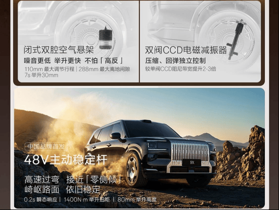 而在底盤(pán)上,極氪9X不僅用了閉式雙腔空氣懸架+雙閥CCD電磁減振,而且還加入了48V主動(dòng)防傾桿,這在國(guó)產(chǎn)車(chē)中還是頭一次,之前都是像路虎攬勝、賓利添越、勞斯萊斯庫(kù)里南等百萬(wàn)超豪車(chē)型才有搭載,有了這些硬件,可以極大提升行駛質(zhì)感和穩(wěn)定性。