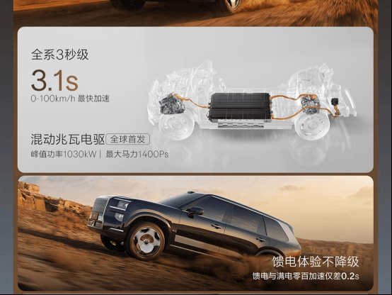 這套動(dòng)力系統(tǒng)可以說(shuō)既高效又強(qiáng)勁,2.0T超混發(fā)動(dòng)機(jī)有46%的熱效率,讓它能夠比同級(jí)1.5T的SUV油耗還低5%~10%,動(dòng)力系統(tǒng)峰值功率可達(dá)1030kW,最大馬力1400Ps,與小米SU7 Ultra的動(dòng)力都相去不遠(yuǎn),3.1秒破百成績(jī)也能超過(guò)一眾超跑,上演一出力大磚飛!并且它即便是在饋電情況下,零百也只比滿(mǎn)電慢0.2秒。