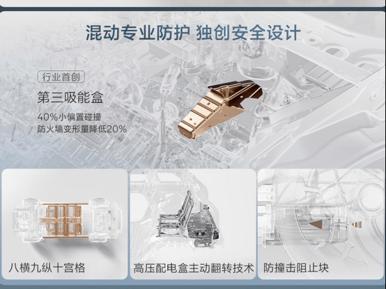并且除了硬,它還能以柔克剛,創(chuàng)造性的第三吸能盒能夠更好地主動(dòng)潰縮化解沖擊,即便是40%小偏置碰撞也能讓防火墻變形量降低20%,而且還有八橫九縱十宮格、防撞擊阻止塊以及高壓配電盒主動(dòng)翻轉(zhuǎn)技術(shù)等創(chuàng)新設(shè)計(jì),可以很好確保油電兩種能源的安全。