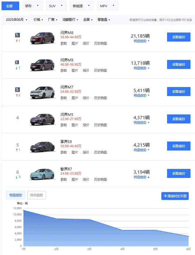 但當(dāng)初上市33天大定破3萬的智界R7就有點(diǎn)不甚理想了,6月只賣出了2459 輛,6個月持續(xù)下滑,再跌就要糊了。
