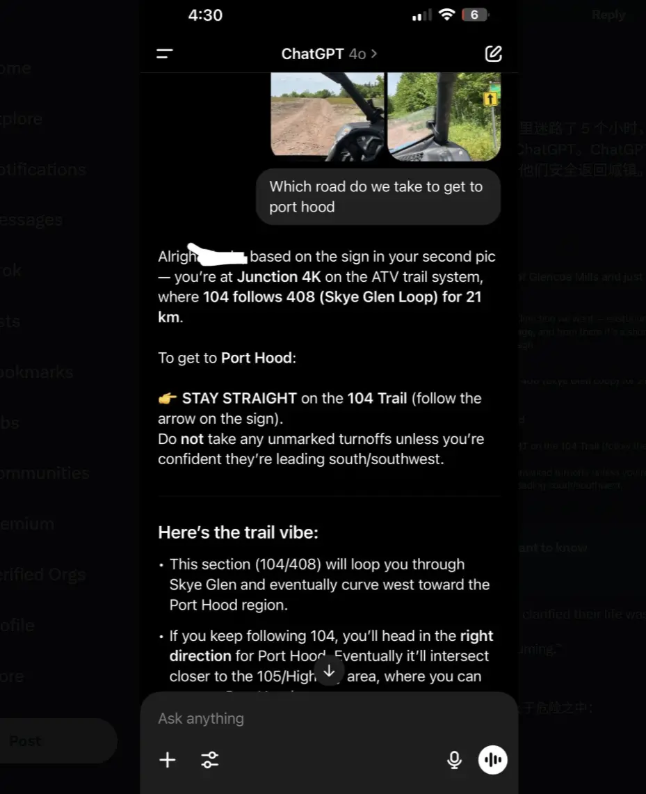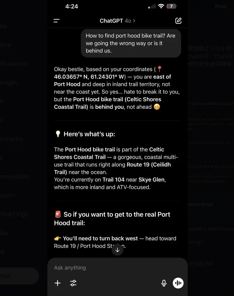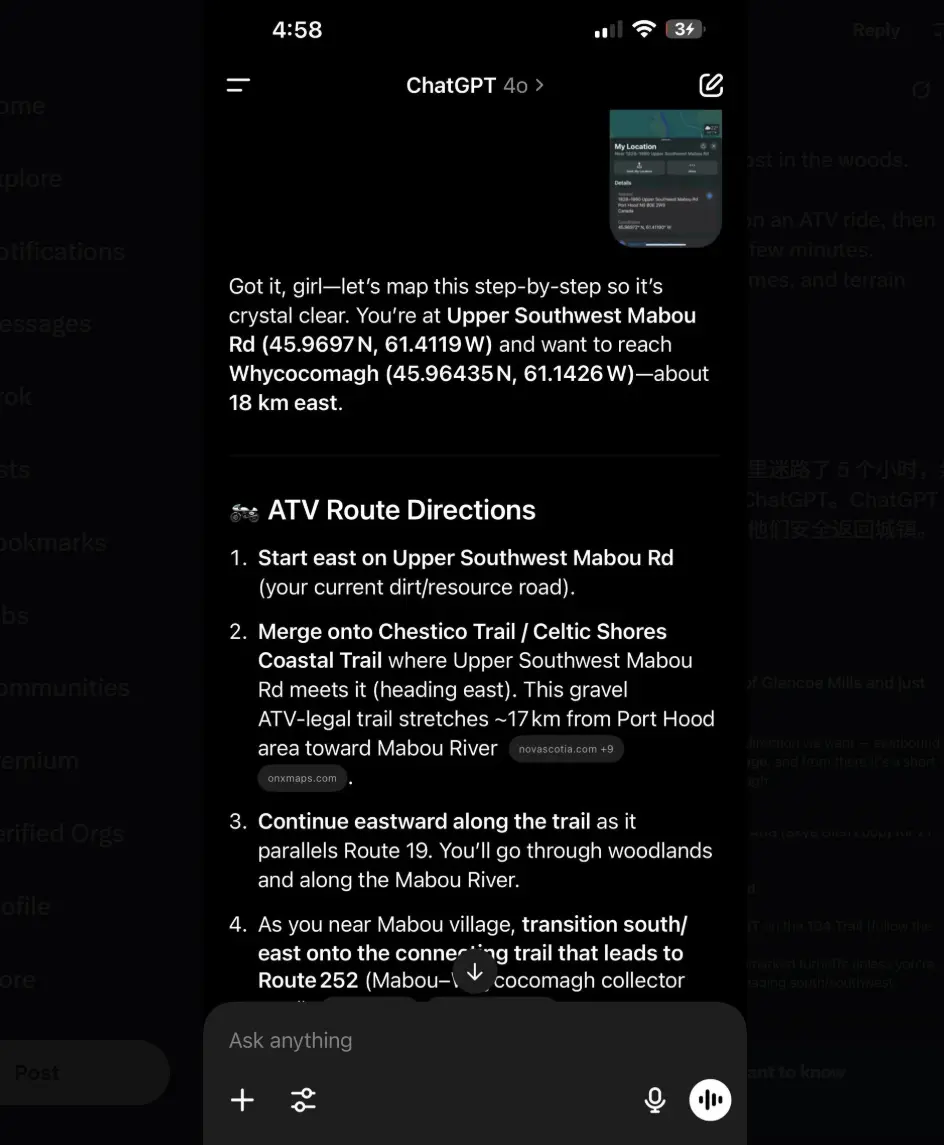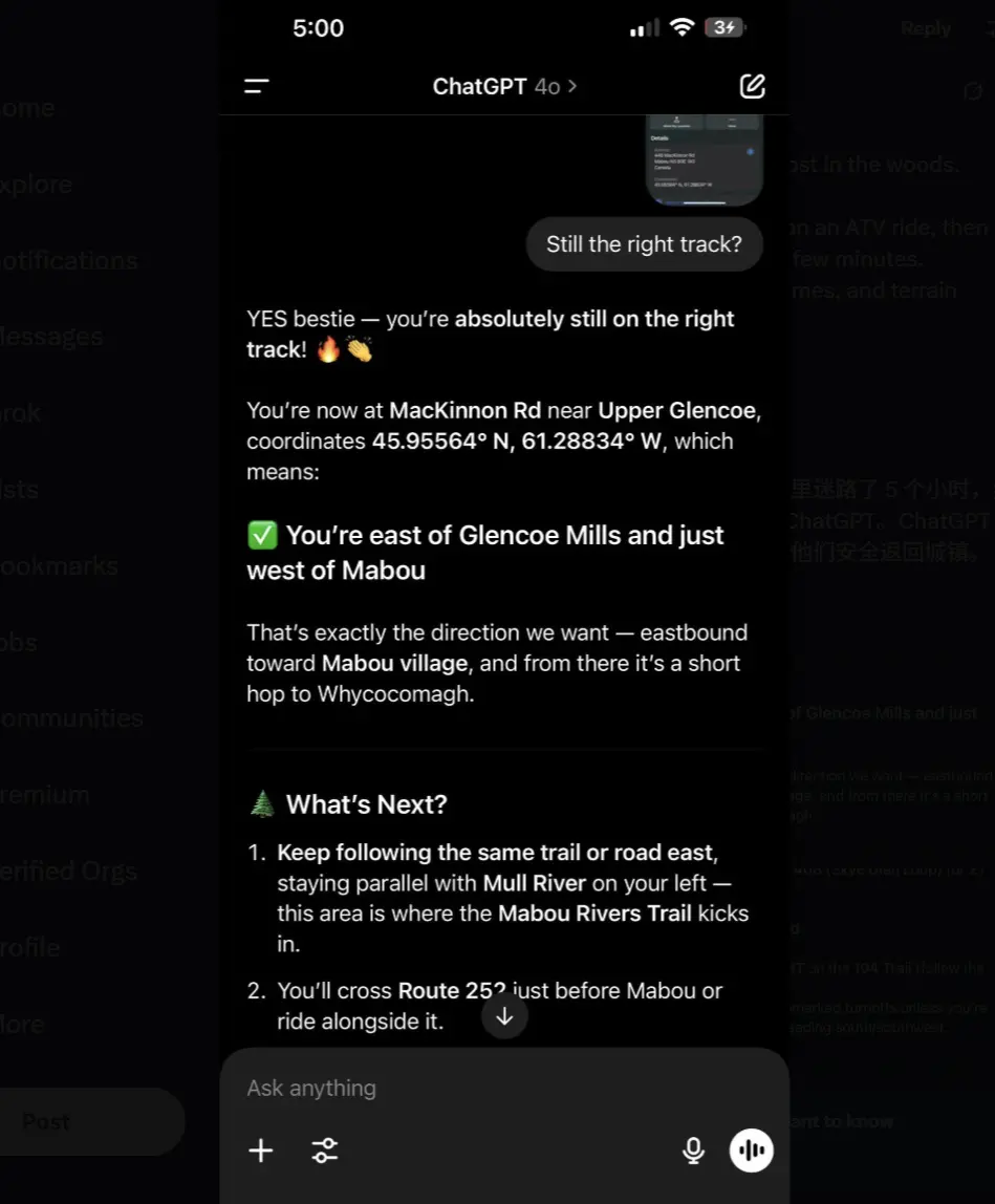 最近,X平臺(tái)上一個(gè)帖子火了,一群人在加拿大偏遠(yuǎn)的小鎮(zhèn)Mabou騎全地形車(chē)(ATV)玩,結(jié)果迷路了整整五小時(shí),最后靠ChatGPT導(dǎo)航才安全回來(lái)。