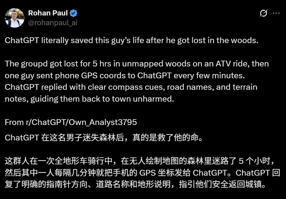 想象一下,你在加拿大的森林里迷路5小時(shí),手機(jī)電量只剩3%,Google Maps失靈,信號(hào)微弱。但ChatGPT靠實(shí)時(shí)坐標(biāo)救了場(chǎng),堪稱(chēng)AI導(dǎo)航的教科書(shū),快來(lái)圍觀。