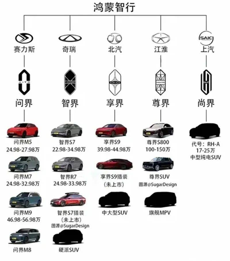圖丨網友繪制的25年度鴻蒙智行全車系前瞻圖,部分車型價格為年初數據未及時更新。部分尚未發布車型為設想圖,作者見圖上標注