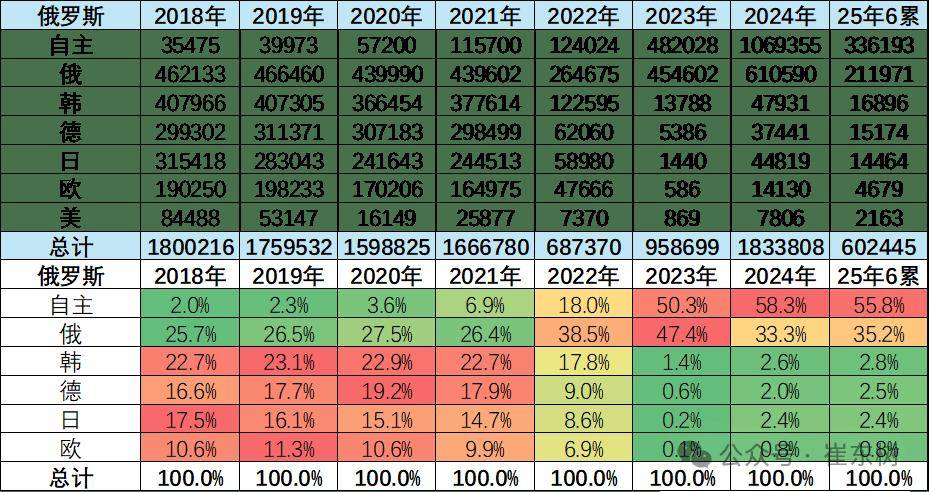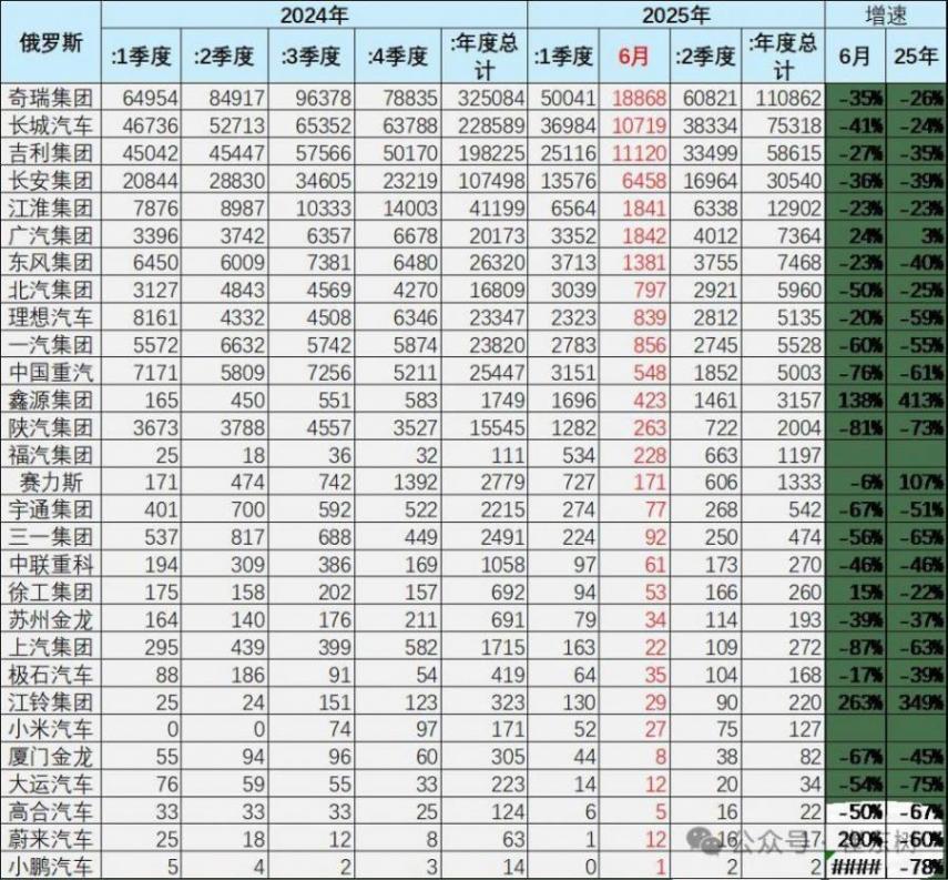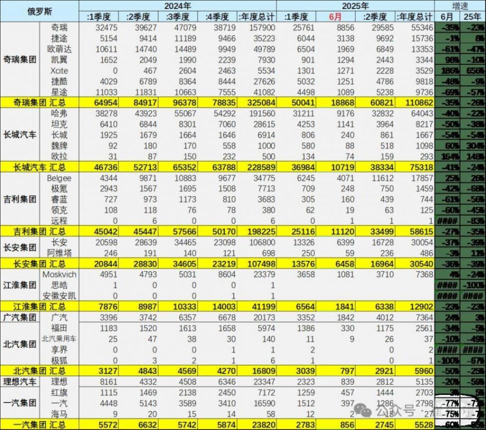 2023年中國出口俄羅斯100萬輛車,自主的俄羅斯市場銷量48萬輛,銷量是中國自主出口量的48%。2024年中國出口俄羅斯128萬輛車,自主的俄羅斯市場銷量107萬輛,自主的俄羅斯市場銷量是中國自主出口量的84%。2025年1-6月中國出口俄羅斯18萬輛車,自主品牌俄羅斯銷量34萬輛,當地銷量是中國出口的187%,終于實現了大幅去庫存的走勢,化解風險。