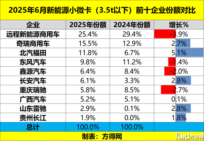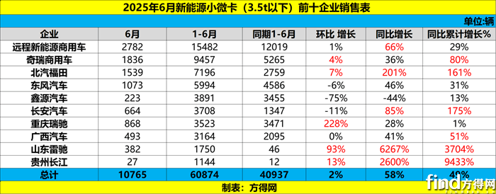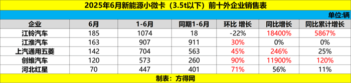 2025年6月,在新能源小微卡同比增長58%、環比微增2%的背景下,哪些企業有著超越行業的表現?