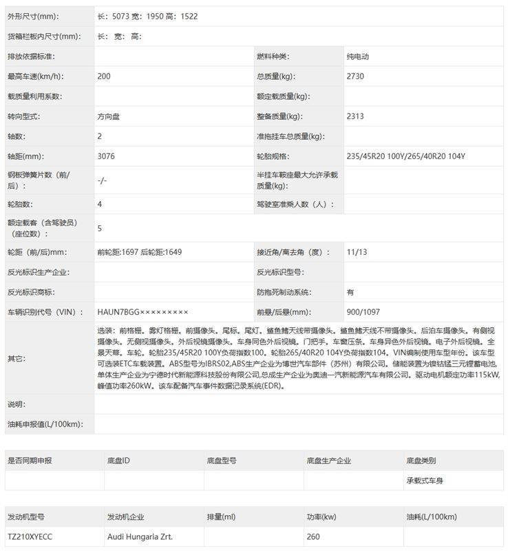 動力部分,一汽奧迪A6L e-tron完成申報的兩版車型均為單電機(jī)后驅(qū),最大功率輸出260kW,預(yù)計配備107kWh寧德時代三元鋰電池,0-100kph加速成績在6秒內(nèi),極速可達(dá)200kph,配備的輪胎規(guī)格為235/45R20 100Y/265/40R20 104Y,WLTC工況純電續(xù)航預(yù)計在750公里左右。除了有單電機(jī)后驅(qū)版,一汽奧迪A6L e-tron在之后預(yù)計還有采用前后雙電機(jī)+電動quattro四驅(qū)系統(tǒng)的高性能版車型。