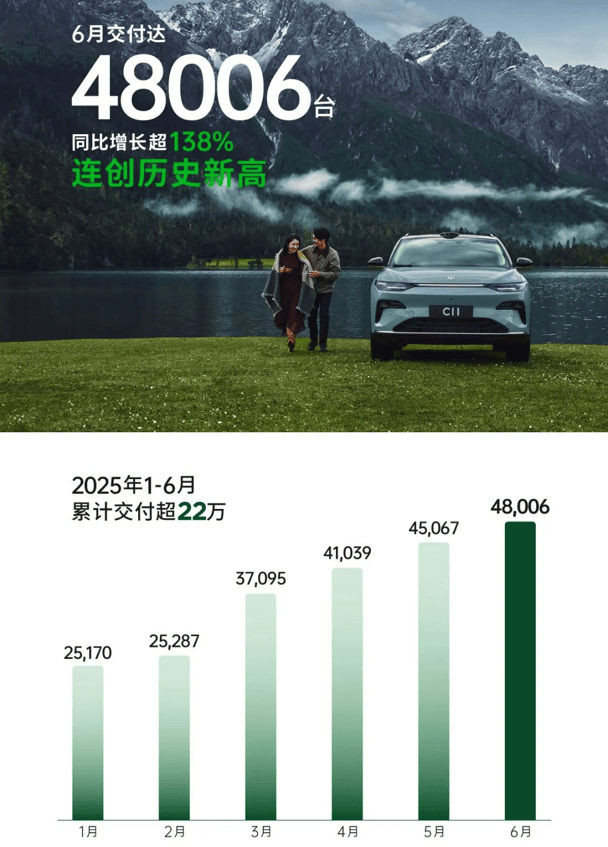 從已公布的銷量數據看,零跑成最大黑馬,上半年累計交付221664輛新車,同比增長達156%,首度登頂半年銷量榜。再看今年6月,零跑單月的全系交付量也已經來到4.8萬輛,同比增幅超過138%,創(chuàng)歷史新高。不過,零跑的逆襲有跡可循,自2024年起,零跑便進入高速增長期,2024年實現104%的顯著增長,2025年連續(xù)4個月蟬聯(lián)新勢力銷量冠軍。