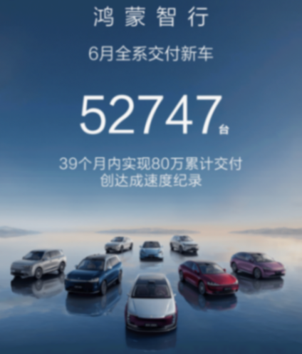 鴻蒙智行上半年累計銷量同樣超過20萬輛,在“四大家族”的共同支撐下維持高位運行。其中6月單月全系交付52747輛,創(chuàng)歷史新高,并成為新勢力月度銷量冠軍。
