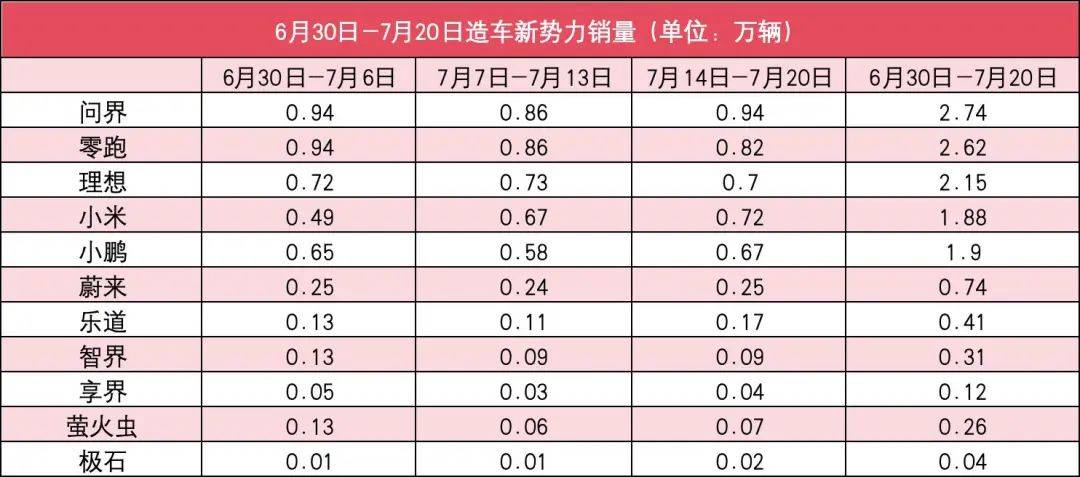 小鵬則位列第五位,7月14日-7月20日,小鵬銷量為0.67萬輛,較前一周增長了0.09萬輛;6月30日-7月20日,小鵬累計銷量為1.9萬輛。從銷量結構來看,主力依然是MONA M03,上周銷量為0.23萬輛;而全新車型G7雖然已經開啟交付,但還沒有進入有待放量,上周銷量為0.08萬輛。隨著這款車的產能和銷量釋放,預計本月小鵬銷量有望繼續破3萬輛。