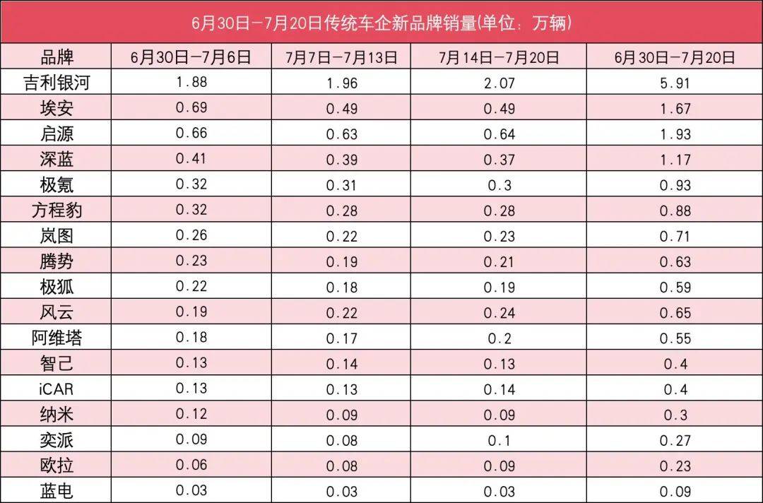 零跑則繼續排在第二位。7月14日-7月20日,零跑銷量為0.82萬輛,較前一周下滑了0.04萬輛;6月30日-7月20日,零跑累計銷量為2.62萬輛。零跑在近期開啟了密集的新品投放,C11、C10、C16三款車型已經完成了改款煥新。而在本周,零跑全新車型B01將開始上市,這款車型憑借著高性價比,開啟預售48小時就收獲訂單超3萬,展現出了爆款潛質。預計隨著這款車型的上市,零跑銷量也將再上一層樓。