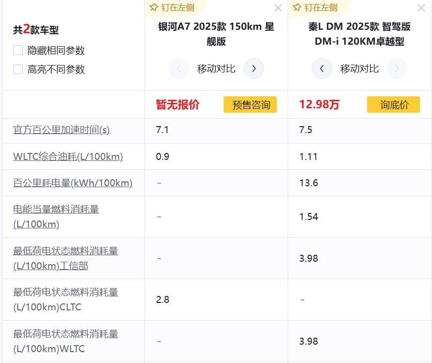 咱們選擇吉利銀河A7的150km 星艦版,預售價13.38萬,這個價位對應的是秦L的120KM卓越型,售價13.98萬,咱們來看一下二者對比情況。