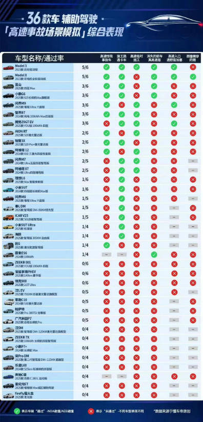 測試結(jié)果可以看到,在六類高速場景測試中,36款車型累計完成了183次測試,但僅有44次測試被評為“通過”,整體通過率僅為24%。而在九類城市道路場景中,參與測試的車型數(shù)量為26款,總測試次數(shù)達233次,通過103次,通過率約為44.2%。即便城市道路的輔助駕駛表現(xiàn)優(yōu)于高速場景,但仍沒有達到讓人“完全放心”的地步。