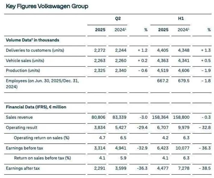 其中大眾集團的最新財報堪稱行業晴雨表:其二季度營收微降3%至808億歐元,但營運利潤慘遭"腰斬式"下跌29%,僅剩38億歐元。算上一季度,大眾集團今年上半年營收 1583.64 億歐元,與去年基本持平,可營運利潤卻從 99.79 億歐元大幅下降至 67.07 億歐元,利潤被關稅嚴重侵蝕。更令人心驚的是,這家德國巨頭被迫下調全年財務預期,坦承"未來面臨高度不確定性"。當歐洲工業皇冠上的明珠都開始黯淡,行業寒冬已是不爭事實。
