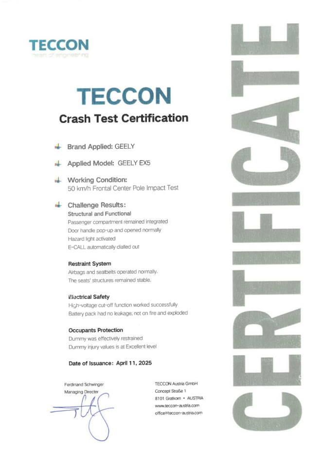 試驗(yàn)結(jié)果顯示,撞擊發(fā)生后,銀河E5的四個(gè)車門均可順利開啟,E-CALL自動(dòng)撥出救援電話,高壓系統(tǒng)即時(shí)斷電,電池?zé)o泄漏、無(wú)起火,氣囊、預(yù)緊安全帶全部正常工作,假人傷害值達(dá)到Euro NCAP剛性墻碰撞的優(yōu)秀水平。這不僅意味著銀河E5具備真實(shí)事故場(chǎng)景下的高強(qiáng)度保護(hù)能力,也標(biāo)志著吉利在智能電動(dòng)時(shí)代對(duì)整車安全系統(tǒng)的深入理解與極致追求。