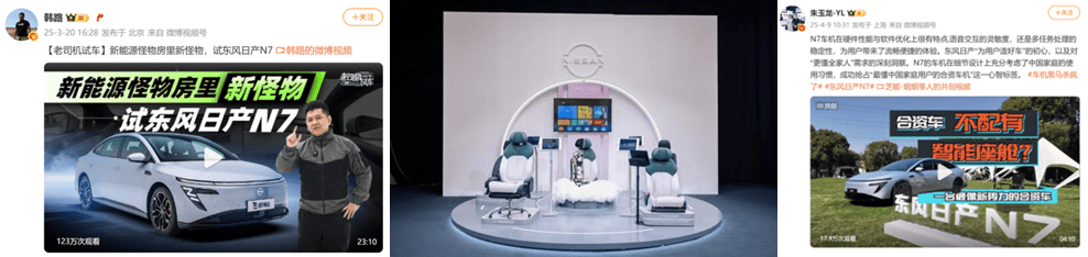 專業種子用戶是產品傳播的核心源點。在N7預熱階段,東風日產開展全國性座艙品鑒活動,圍繞N7同級獨有的“家用超舒適四件套”,打造真實且全面的座艙體驗場景,邀約專業用戶、達人及品牌車主深度體驗“最適合家用的智能舒適座艙”。通過真實化、場景化的產品零距離體驗,眾多嘗鮮的媒體、達人及車主紛紛種草,評價“遮住車標就是一臺新勢力產品”,并成為N7的首批真實口碑傳播者,掀起一波以多元圈層為基礎的巨浪式口碑內容流量,將“最適合家用的純電轎車”的產品形象深植消費者心智。