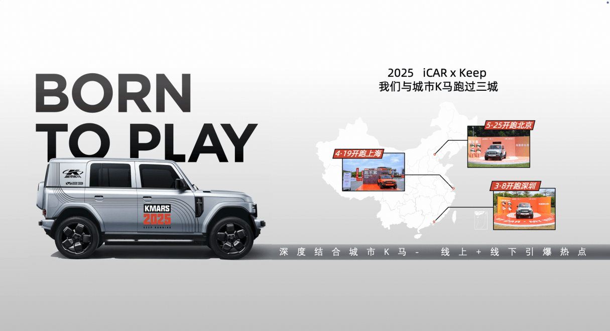 4、當「天生會玩」的iCAR遇上「天生愛跑」的城市K馬升級打造年輕圈層心目中最「會玩」的汽車品牌,強力助力深圳、上海、北京三城開跑,與跑者玩在一起;