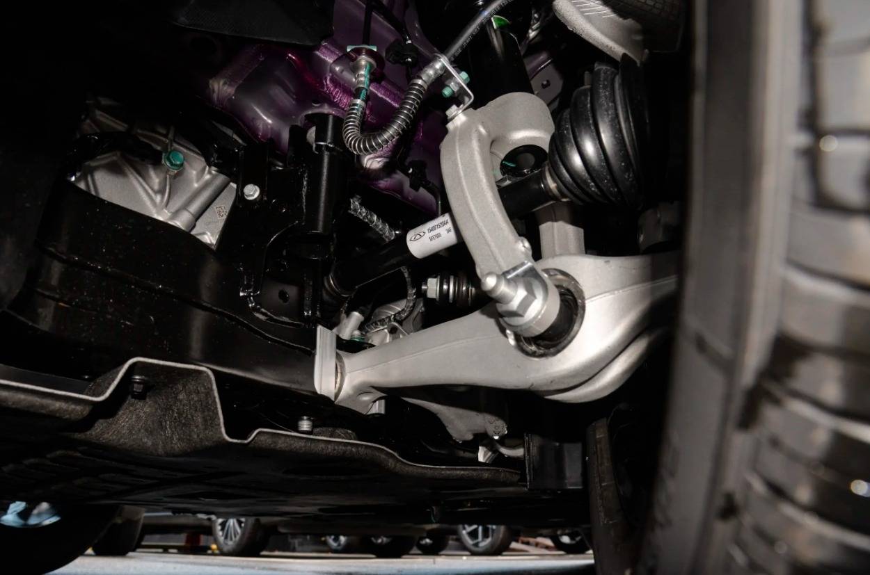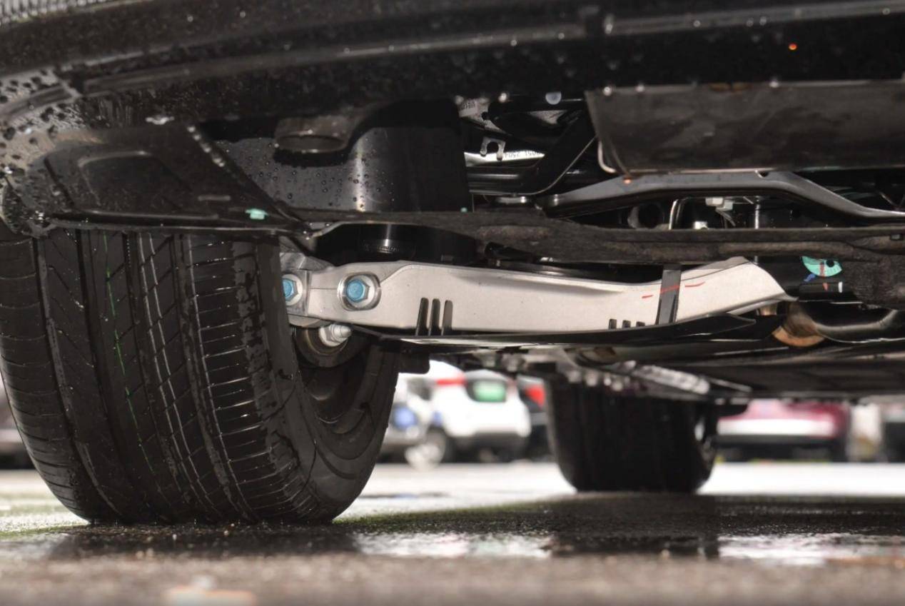 當車身尺寸接近532(5米長,軸距3米,寬2米)這樣的標準時,操控靈活性便成為巨大挑戰(zhàn),風云A9L的解決方案是“堆料”,首先使用了前雙叉臂+后五連桿這樣的德系車常見結(jié)構(gòu),全鋁合金的雙叉臂要比傳統(tǒng)的麥弗遜更精準,尤其在橫向抗壓方面,而五連桿占用的橫向空間比傳統(tǒng)的E形多連桿更小,可以在后軸布置電機。