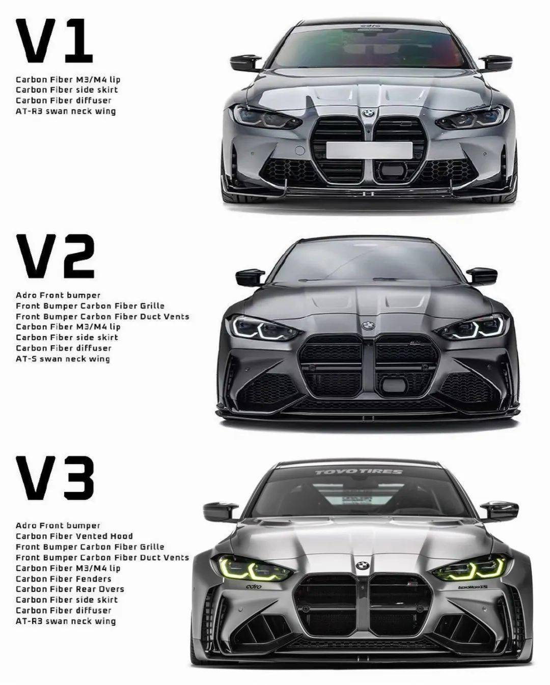 ADRO的M4改裝有多個版本,從V1到V3逐級提升,外形也越發夸張,特別是寬體的程度,本次試玩的模型外形參考的是V3版本的寬體風格,空洞學的應用已經到了相當夸張的程度。前包圍縮小雙腎格柵面積10%,縱向尺寸縮減,橫向比例更接近正方形,搭配梯形下中網及立體風刀導流口,提升散熱效率與視覺侵略性。加寬翼子板、碳纖維前唇及側裙,強化車身寬度感知,降低風阻系數。