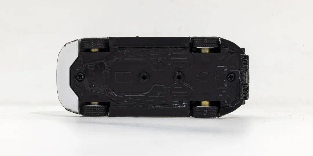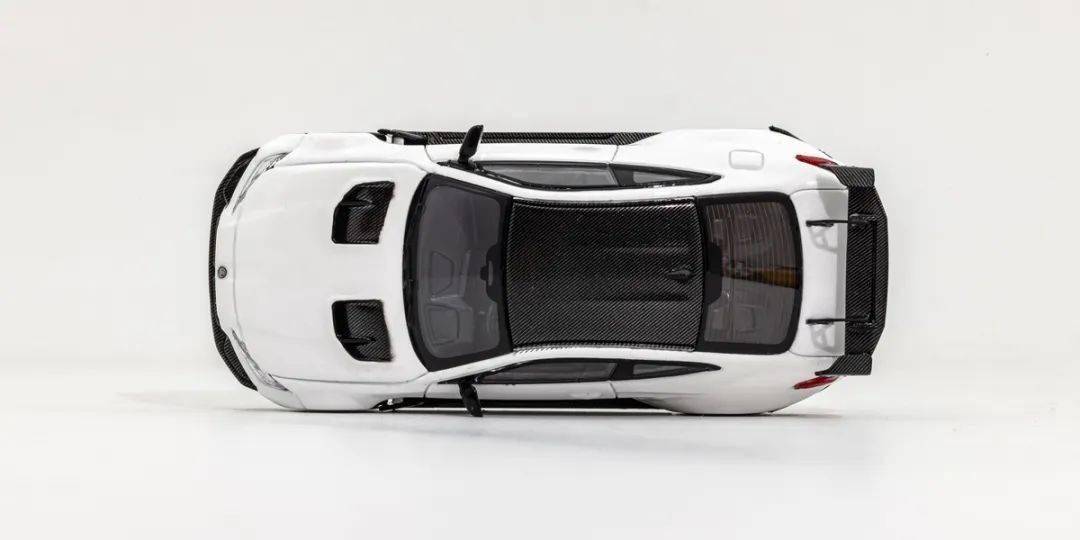 模型的外形不存在大問題,比例上也符合真車的情況;白色素漆面質感還是很好的,縫隙也很自然,也有沒有出現縫隙邊緣露底的現象;模型的側包圍時獨立分件,而且都覆蓋了移印的碳纖維,前輪后側及后輪前側都有鏤空的風刀,前唇盒后包圍也都做了移印碳纖維,后輪后側也有鏤空的碳纖維風刀;車外后視鏡為獨立分件,車窗邊框也是黑色的,B柱是立體的,尾翼也是獨立分件的,尾翼也全部覆蓋了移印的碳纖維,尾翼兩側的風刀還有螺絲孔細節;模型的整體細節相當豐富。