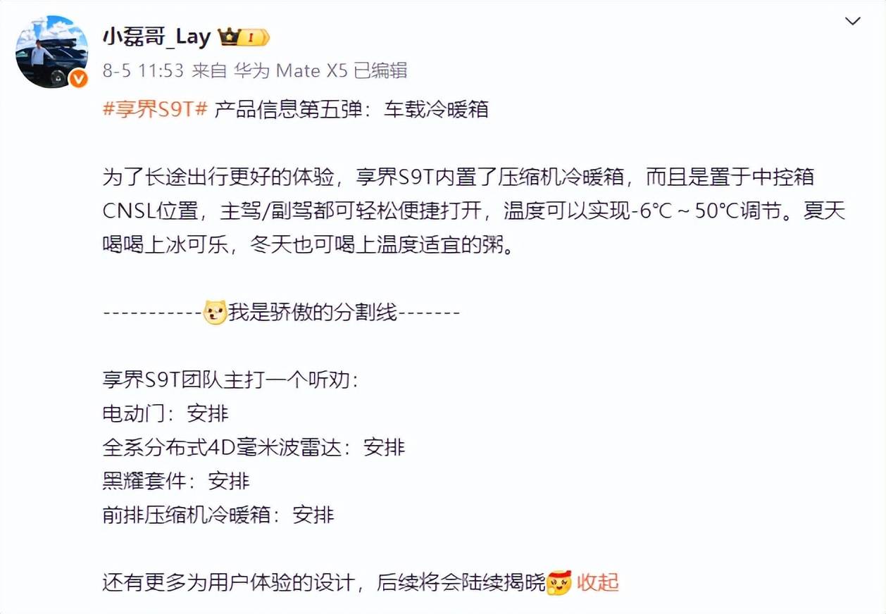 另外,享界S9的豪華舒適性本就聲名在外,享界S9T也自然不例外。中央扶手箱處內(nèi)置了一臺有著6.2L超大內(nèi)部空間,可-6-10°C制冷、35-50°C加熱的壓縮機(jī)冷暖箱;智能空調(diào)具備三溫區(qū)獨立設(shè)置,新增B柱出風(fēng)口,可提升升溫降溫的速率,不管是夏季還是冬季出行,都能更加舒適。