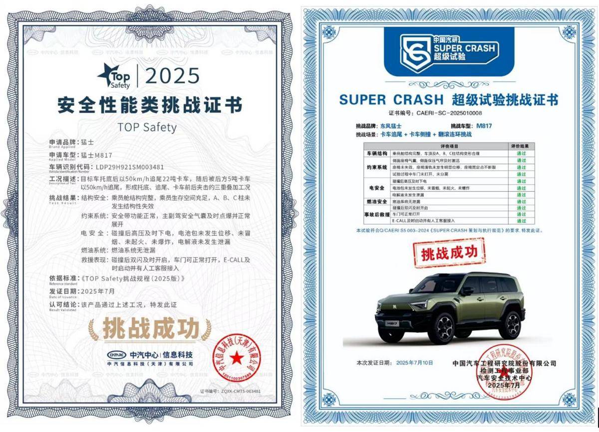 猛士M817將“軍工基因”轉化為民用安全標桿。其戰甲車身采用12.48米超長2000MPa熱成型鋼骨架,83.2%高強鋼占比構筑環抱式座艙。最震撼的是車門結構:1500MPa一體式熱成型門環+2000MPa防撞板+9孔加強梁,形成類似坦克艙門的復合防護層——這在側面碰撞測試中,能降低40%乘員受傷風險。