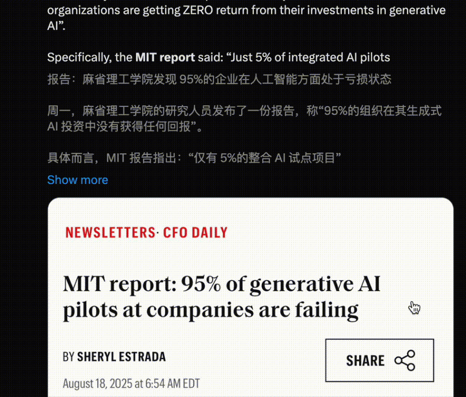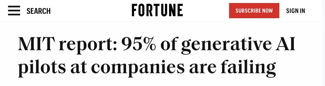 那些登上新聞頭版「95%失敗率」,特指的是,企業委托供應商或內部開發的、昂貴且定制化的企業級AI解決方案。