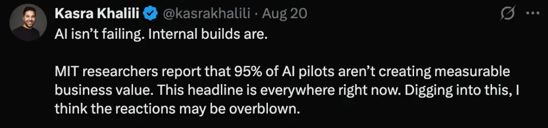 一位VC投資人Kasra Khalili一句話道出了真理,「AI并沒有失敗,而是公司內部構建系統的失敗」。