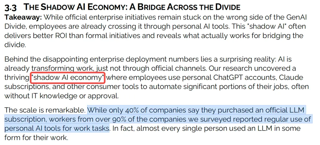 換句話說,員工使用AI頻率,是企業采納率的2倍多,這種現象被稱為「影子AI經濟」。