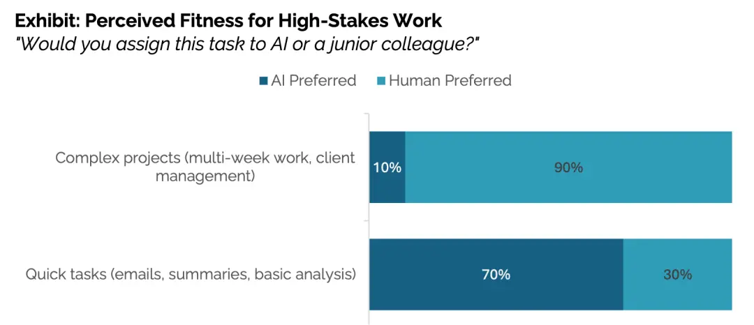 70%員工在處理郵件、基礎分析等快速任務時,直接找AI而非同事;但對于復雜的、高風險的工作,90%員工更信任人類。