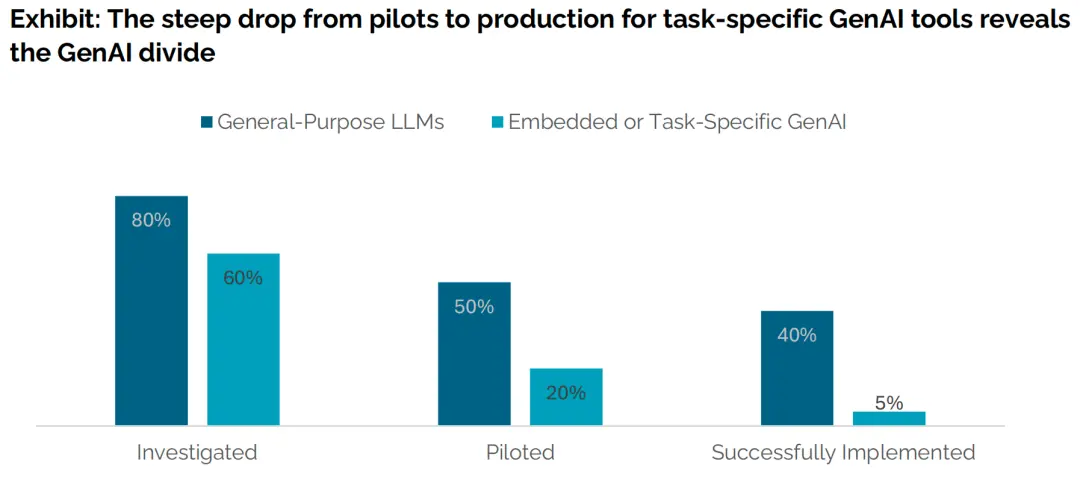 像ChatGPT這樣的通用AI工具投入生產的成功率為40%,而針對特定任務的企業級工具成功率僅為5%