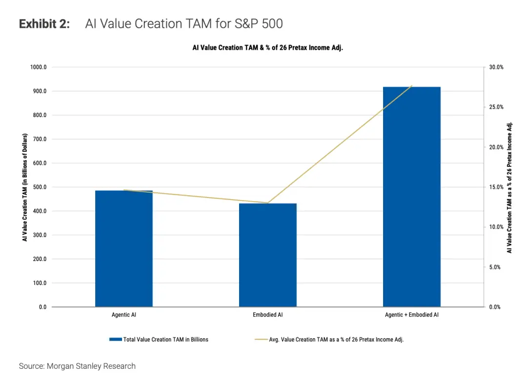 其中的一項分析稱,由AI帶來的顛覆性變革,或能為標普500公司每年節省9200億美元的成本——相當于總薪酬的41%,或2026年稅前利潤的28%。