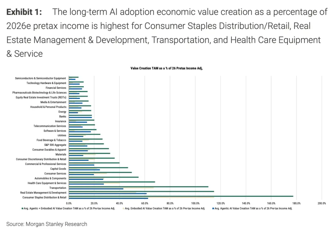 比如日常消費品的分銷與零售、房地產管理以及交通運輸業是受沖擊最大的幾個行業。其中,由AI驅動的潛在生產力提升,預計將超過2026年預測收益的100%。