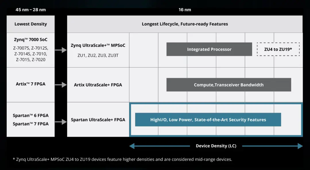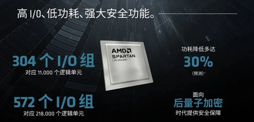 這一產品組合中的最新產品就是AMD Spartan UltraScale+ FPGA,其專門為降低功耗、成本、保持高性能而設計,且還會提供靈活的I/O、PCIe接口、集成內存和系統監控。同時,AMD還提供了不同的架構,使企業能夠根據不同的應用場景在尺寸、功能之間靈活選擇。