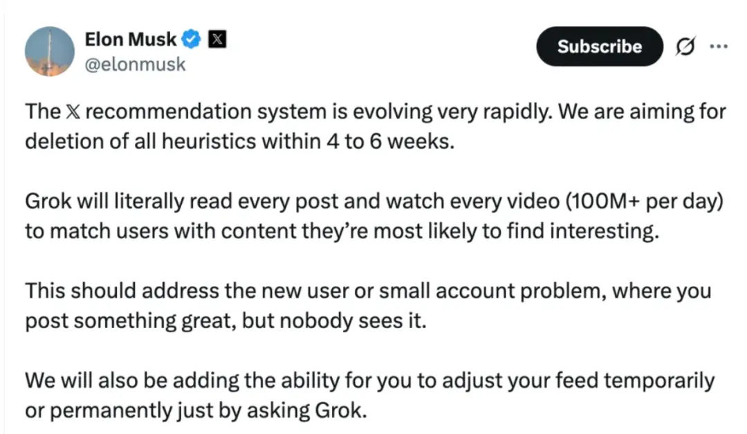 當時老馬表示,要在未來幾周內徹底移除X啟發式推薦算法,由Grok接手,通過閱讀和觀看全部內容來全自動匹配用戶興趣。