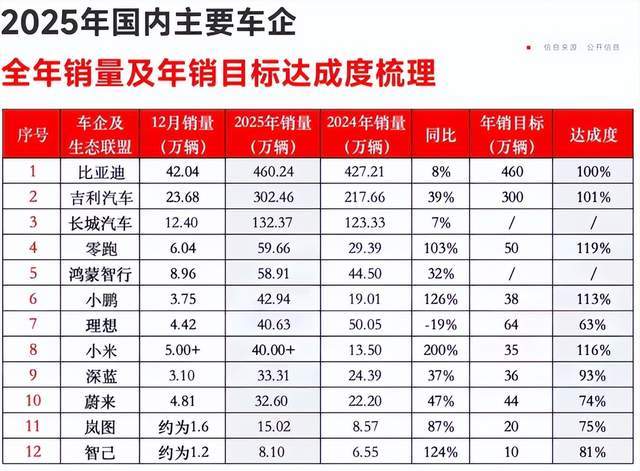 當時根據媒體的統計,2025年全年,主要車企中,定了公開目標又完成的,只有5家,分別是比亞迪、吉利、零跑、小米、小鵬這5家,另外更多的車企,都沒有完成目標。