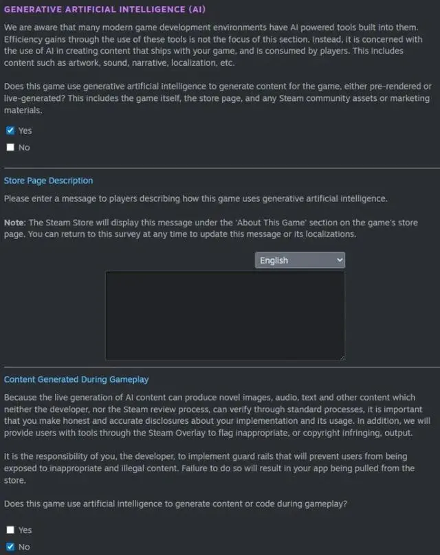 新的披露規則主要涵蓋兩類情形。第一類是生成式 AI 參與制作并隨游戲發布的內容,包括美術、音效、劇情、本地化文本、商店頁面介紹以及營銷素材。凡涉及此類使用,開發者必須在商店頁面“關于本游戲”欄目中說明 AI 的具體用途,并可根據情況進行更新。