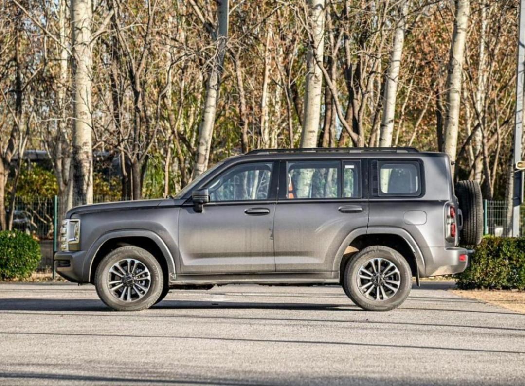 再來看新車的車身側面部分,車身造型平直且方正,方盒子的外觀式當下市場的主流設計,平直的車頂結合熏黑行李架設計,整體的越野氛圍以及肌肉感都是得到體現,車門部分外擴明顯棱角腰線貫穿車身,下方內凹的造型以及外擴明顯的輪眉,厚重感與立體感還是不錯的,車身尺寸方面,新車的車長分別為4950/5070毫米,低配拓境版配備固定式側踏,車寬1976毫米,高配極境版則配備電動側踏,車寬1960毫米,車身高度均為1930毫米,軸距為2850毫米。大尺寸的車身表現也是看起來很豪華。