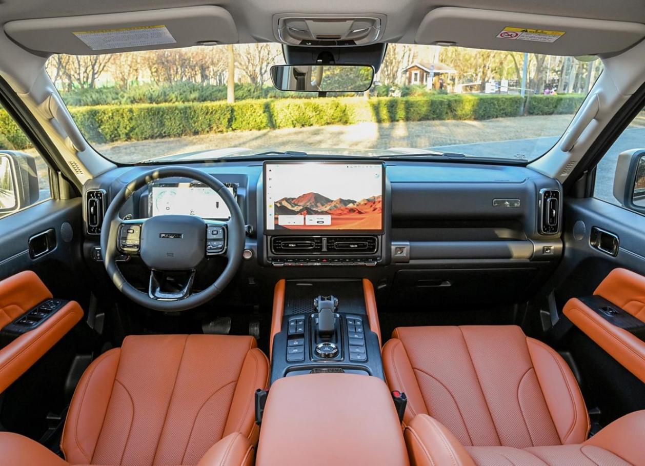 進入車內,新車平直的中控臺很厚重,而且兩側縱置的空調出風口以及多條平直的線條,整體看起來很硬朗,并且還配備大尺寸全液晶儀表和14.6英寸中控屏,可以支持10點觸控、語音交互等。中控屏下方配有實體按鍵,操作起來流暢且便捷,而換擋桿四周提供多個實體按鍵和旋鈕,可以調整座椅加熱/通風、駕駛模式、前后橋差速鎖、低速四驅、坦克掉頭等功能。為了能夠更好的滿足大家的露營需求,后備廂還有著220伏/400瓦電源,戶外露營以及自駕都很適合。