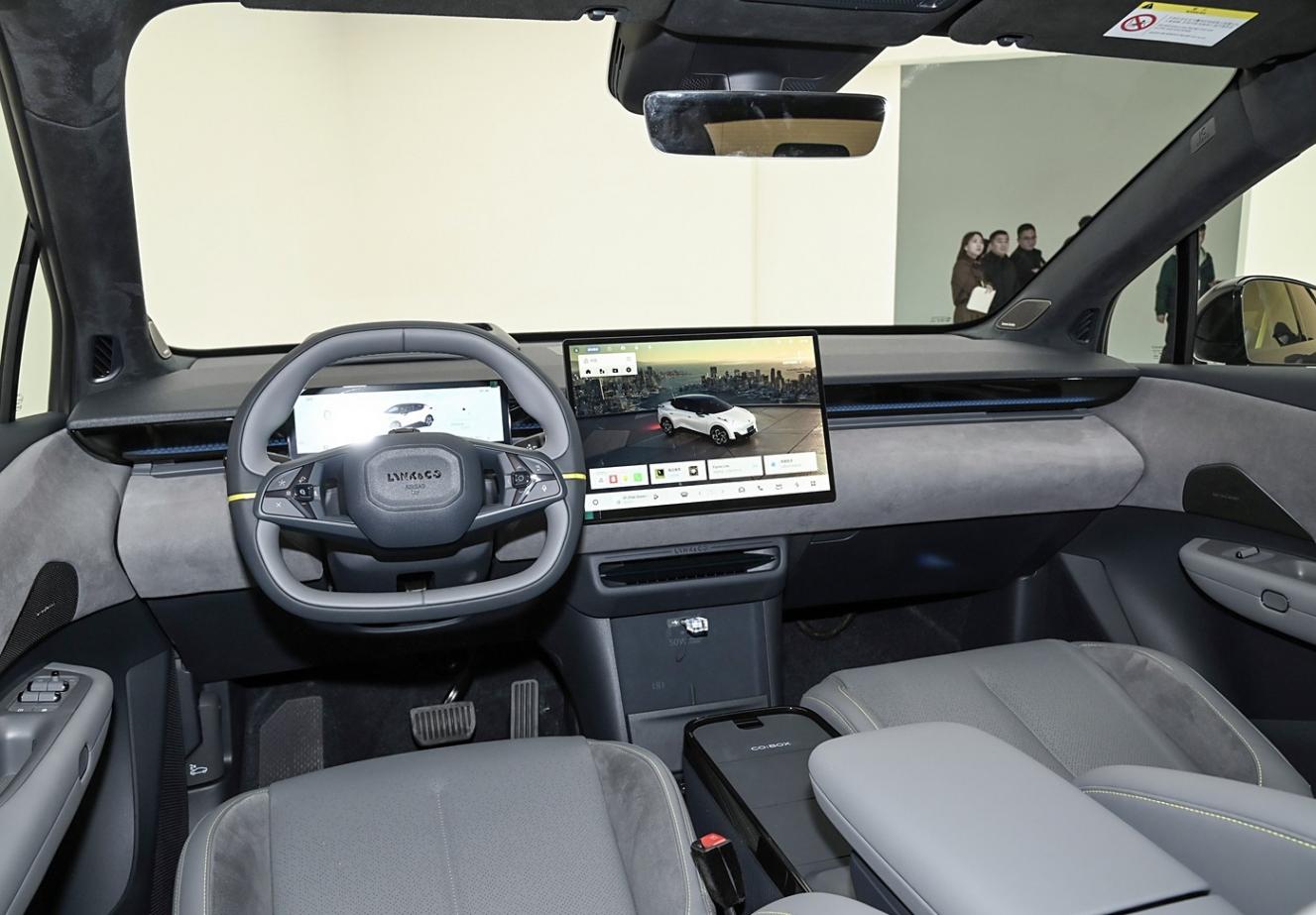 進入車內,新車內飾造型很簡約,門板、中控臺、頂棚以及座椅都是有著大面積的翻毛皮材質包裹,有著出色的檔次感,扁平的雙幅式多功能方向盤有著很濃郁的運動風格,而懸浮式的液晶儀表以及中控大屏都能夠增加科技感,扶手區域與前方中控臺為分體式設計,可以放置原廠提供的CO:BOX收納箱,還可用于放置其他物品,手機無線充電面板垂直于地板布置。