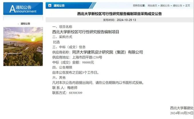 10月29日,西北大學發布《西北大學新校區可行性研究報告編制項目采購成交公告》,正式公布由同濟大學建筑設計研究院(集團)有限公司中標。