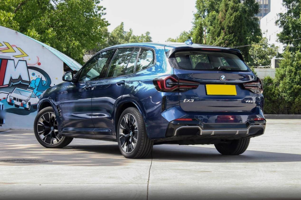 寶馬iX3在側面造型上增加了斜向上揚的粗壯筋線,同時鋒利的棱角造型也讓腰身區域增加了力量感,前翼子板處帶有充電板和鍍鉻導流槽,車門區域的亂流可被導入車門的內凹區域,使整車風阻進一步下降,車窗區域則采用鍍鉻飾條封邊,在尾窗區域依然保持了車系經典的上揚夾角。車尾的造型也與燃油版車型相似,頂部的擾流板增加了黑色飾邊,同時兩側帶有微微的隆起,配上中部的剎車燈帶,展現出較為運動化的氣質,尾燈依然是熏黑的鑰匙狀造型,點亮后擁有前衛的視覺感,車尾區域采用了外擴的組件設計,兩側排氣區則改為了封閉處理。